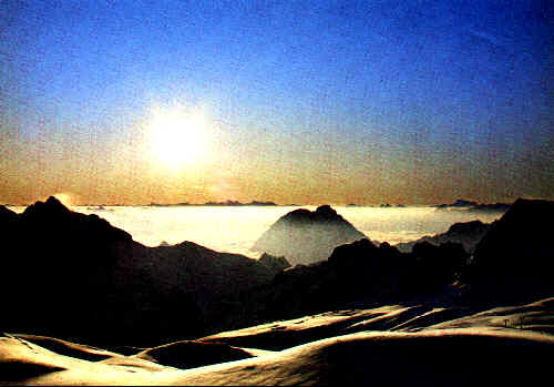Im Osten entsteht ein blasser roter Streifen. Er wird größer und größer und entflammt sich zu glühendem Rot. In diesem Meer von Glut schwebt ein mächtiger, roter Ball - die Sonne.