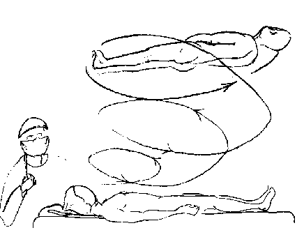 "Nach einer Loslösung vom physischen Körper bewegte ich mich einige Zeit im Raum umher. Ich konnte nur sehr schleierhaft sehen und folgte deshalb tastend den Wänden. Dann wollte ich wieder in meinen Körper zurück, wußte aber nicht wie. So legte ich mich entlang der linken Seite des grobstofflichen Körpers hin und versuchte so in ihn hineinzuschlüpfen. Doch es gelang mir nicht. Nach einem zweiten Versuch öffnete ich die Augen und glaubte wieder zurück zu sein, konnte jedoch den Körper nicht bewegen. Nachdem ich mich wieder ca. einen Meter vom grobstofflichen Körper entfernt hatte, versuchte ich mehrmals wieder auf die vorherige Art in den Körper zurückzukehren. Hierbei verspürte ich entlang meiner rechten Seite, die dem physischen Körper zugewendet war, einen Widerstand, so als ob ich an kantige Steine anstieße. Schließendlich rutschte ich wieder in den physischen Körper zurück." (Dh)