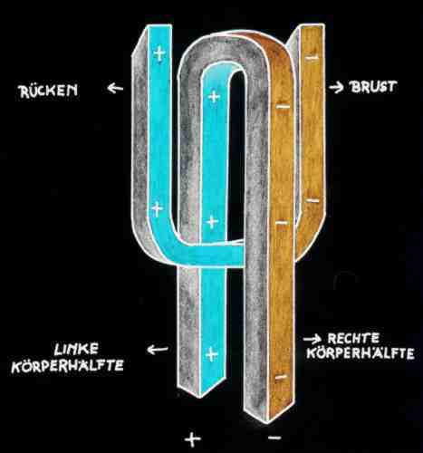 Odpolaritäten, wie sie am Magneten festgestellt werden. Sie bleiben immer gleich, egal, welche Lage der Magnet einnimmt. Das Erscheinungsbild des Magneten eignet sich zu einer vereinfachten Darstellung der Polaritäten des Menschen.![]()