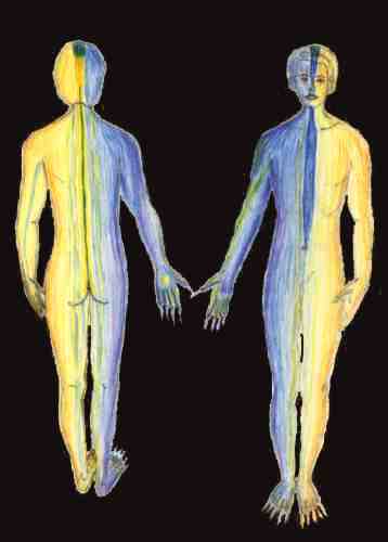Stärker differenziert und nicht mehr so deutlich sichtbar zeigen sich am Menschen außer den oben/unten Polaritäten auch solche zwischen vorne und hinten, rechter und linker Seite. Dasselbe Bild wiederholt sich an den Gliedmaßen. Die Untersuchungen jener differenzierten Polarisationen wurden von H. Durville an Medien mittels Mesmerismus durchgeführt. Die Ergebnisse befinden sich in sehr guter Übereinstimmung mit den yin/yang Polaritäten im Taoismus und der Akkupunktur. Die gelbe Polarität entspricht yang, die blaue entspricht yin.