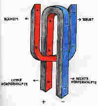 Stärker differenziert und nicht mehr so deutlich sichtbar zeigen sich am Menschen außer den oben/unten Polaritäten auch solche zwischen vorne und hinten, rechter und linker Seite. Dasselbe Bild wiederholt sich an den Gliedmaßen. Die Untersuchungen jener differenzierten Polarisationen wurden von H. Durville an Medien mittels Mesmerismus durchgeführt. Die Ergebnisse befinden sich in sehr guter Übereinstimmung mit den yin/yang Polaritäten im Taoismus und der Akkupunktur. Die gelbe Polarität entspricht yang, die blaue entspricht yin. |