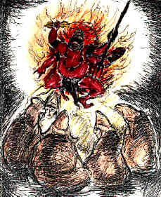 nieder und fragte ihn leise: "Auf wen warten wir?" Als wäre dies das Stichwort gewesen, betrat ein großer, breitschultriger Mann mit hoheitsvoller Miene den heiligen Platz. "Das ist Drukh Schim, der große Zauberer", flüsterte Scherap. "Er ist berühmt für seine Zauberkraft im ganzen Norden unseres Landes." Schweigend, ohne einen der Anwesenden zu begrüßen, bestieg Drukh Schim den Findling und hockte sich auf dessen Plattform nieder. In seiner rechten Hand hielt er einen menschlichen Hüftknochen, neben seiner Linken lag eine menschliche Schädeldecke. Ohne daß Harrison irgend ein Zeichen bemerkt hätte, begannen auf einmal alle Zauberer, sich hin und her zu wiegen. Dabei stießen sie tiefe, singende Töne aus. Und dann plötzlich die Beschwörungsformel: "Yamantaka! Yamantaka! Yamantaka!" Der Ruf nach Yama, den Höllenfürsten. Nach der dritten Wiederholung dieses Wortes hob Drukh Schim den menschlichen Hüftknochen an die Lippen. Er war ein Horn, dem ein getragener, trauriger Ton entquoll. Die Zauberer wiegten sich schneller und schneller. ,,Yamantaka! Yamantaka! Yamantaka!" Harrison fühlte, wie ihn ein unbekanntes Gefühl ergriff, das seine Skepsis töten wollte. Er merkte, wie er auf Yama wartete, obgleich es ihn doch eigentlich nicht geben konnte. Wollte dieser Mann dort auf dem Findling sie alle hypnotisieren? Um dem zu entgehen, beschloß Harrison sich auf ein Schachproblem zu konzentrieren. Es war unmöglich. Immer wieder kehrten seine Gedanken zu Yama zurück. Das abscheuliche Bild, das der alte Scherap ihm von Yama entworfen hatte, formte sich bildhaft in seinem Gehirn. Nur in seinem Gehirn ?...Ungläubig starrte Harrison auf den Platz vor dem Findling. Nein, das war keine Vision. Er, Roy Harrison, aus dem Königreich Egland sah ihn ganz deutlich: Yama, den Schrecklichen, den Fürst der Hölle. Zuerst war er nur ein Nebelstreifen, an den sich ein anderer und dann ein dritter reihte. Dann sah er die hervorquellenden, leuchtenden Augen. Sie stierten voller Tücke und Bosheit. Rechts und links von diesen Augen verdichteten sich gerheimnisvolle Nebelschwaden. Auf einmal brachen sie auseinander...und formten sich zu vierunddreißig Armen und vierunddreißig Händen, von denen jede ein Instrument der Zerstörung hielt: Dolche, Pfeile, Speere, Messer... Von jeder der beiden Schultern Yamas hing eine Kette aus menschlichen Schädeln. Auch vom Hals herab fiel eine doppelte Kette von Totenköpfen, die bei der kleinsten Bewegung grauenerregend klapperten. Harrison erschauerte. Jetzt überkam ihn ein Gefühl der Furcht, das alle anderen auch zu haben schienen. Die Furcht, daß sie Yama mit ihrem Willen nicht wieder bannen könnten. Scherap hatte ihm erklärt, wie schrecklich es wäre, wenn Yama ihrer Willenskraft entschlüpfen würde. Er würde durch das Land rasen und größtes Unheil anrichten. Er würde das Vieh töten und die Weiden verdorren lassen. Kurz, Yama würde mehr Unheil verbreiten, als auch der höchste aller Lamas wieder gutmachen konnte. Wer würde siegen? Harrison spürte es fast körperlich, wie die Nukhwas ihre Willenskraft vereinigten, um Yama zu zähmen. Eine Ewigkeit schien zu vergehen. Dann, endlich, begann die Erscheinung zu verblassen. Und Harrison, wie alle seine Zauberkollegen, fühlten eine wilde Freude, als sie bemerkten, daß sie Sieger blieben. Ein Teil Yamas nach dem anderen löste sich auf, bis zuletzt nichts übrigblieb als zwanzig Zauberer und Drukh Schim, der allein auf seinem Findling saß. Harrison war in kalten Schweiß gebadet. Er zitterte am ganzen Körper. |