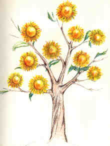 Acharya, 6.März 1975 "Ich ging einen neu entdeckten Weg zum Ashram (Yogazentrum). Er führte durch eine sehr schöne, gepflegte Parklandschaft. An einer Stelle waren besonders viele Blumen, unter anderem auch Sonnenblumen. Dann sah ich vor mir einen Baum, dessen Krone von großen Sonnenblumen in leuchtend gold-gelber Farbe gebildet wurde." Deutung: der Baum steht als Symbol für den Menschen (nach Jung mütterlicher Aspekt, beim Mann ein Aspekt seiner Gefühlswelt). Der Baum als Symbol des Körpers ist überall sonnenhaft durchlichtet. |